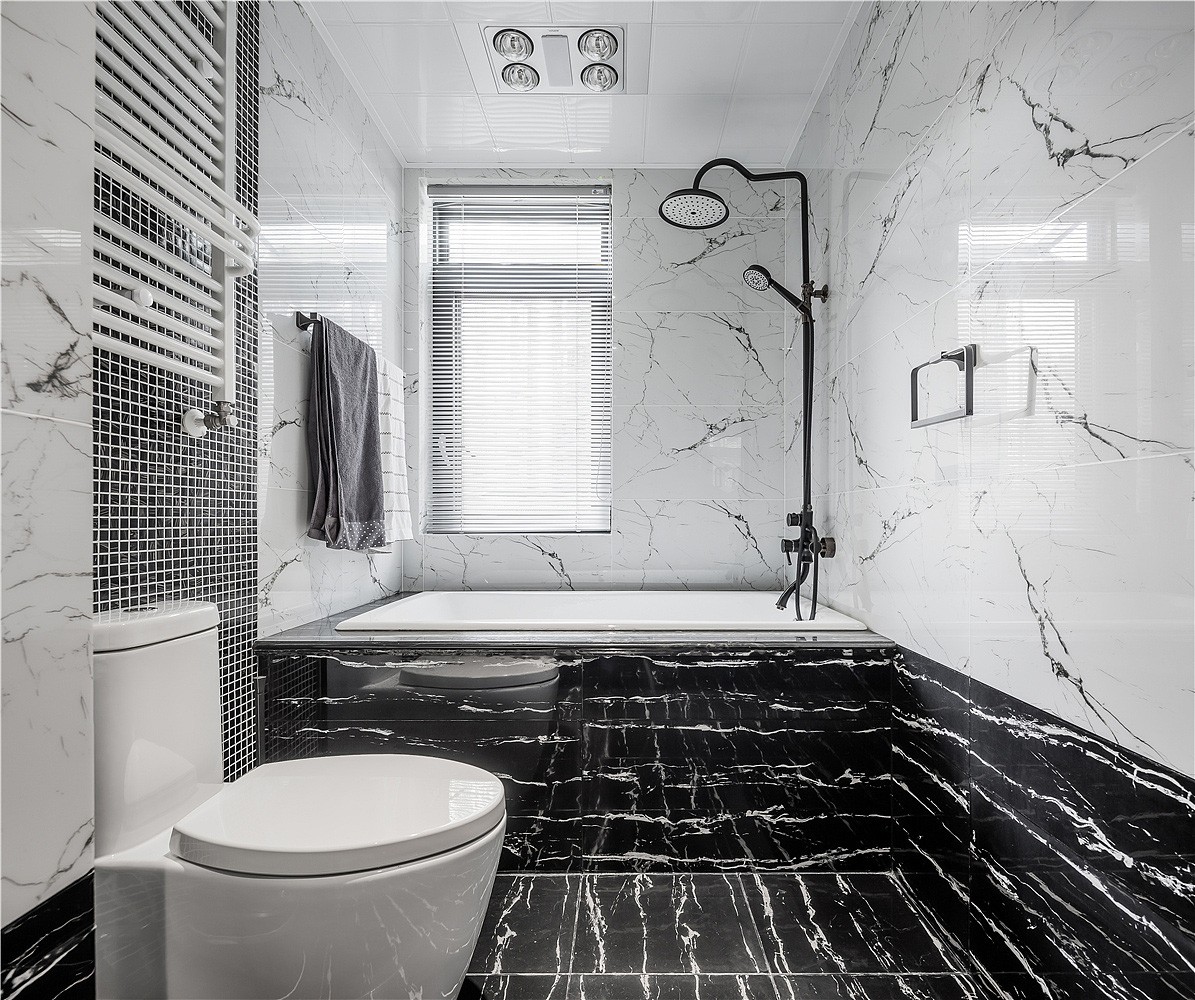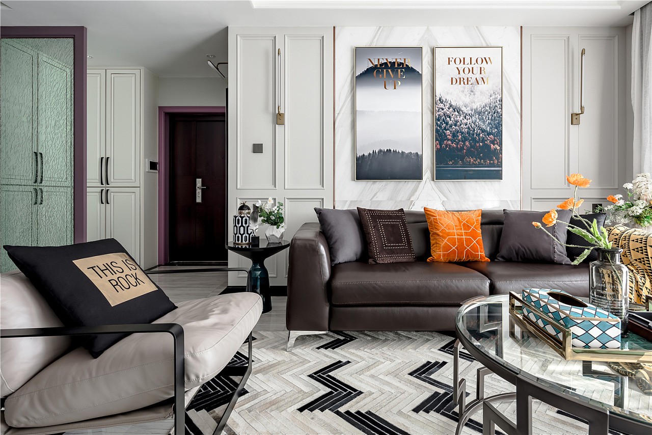 入戶門廳以白色作為基調(diào),紫色門套作為點綴,整體空間驚艷脫俗。地板選用更易清洗、更耐磨損的全瓷磚鋪設(shè),大理石貼墻與地面一起,把客餐廳的整體基調(diào)定在了一個雅字上,典雅大氣。深色的皮質(zhì)沙發(fā)把整個客廳的冷色調(diào)提了起來,像一杯香醇的咖啡,迅速捂暖了大理石的冷硬。主臥室淺棕色、黑色、紫色、白色,四大色塊干凈利落的劃分出主臥的空間層次,床頭細(xì)節(jié)的處理使空間更有縱深感。主衛(wèi)生間銀白龍和爵士白的采用與客廳的整體色調(diào)一脈相承,三種切割成不同大小的瓷磚拼接造型,使小小一方天地也能層次分明。