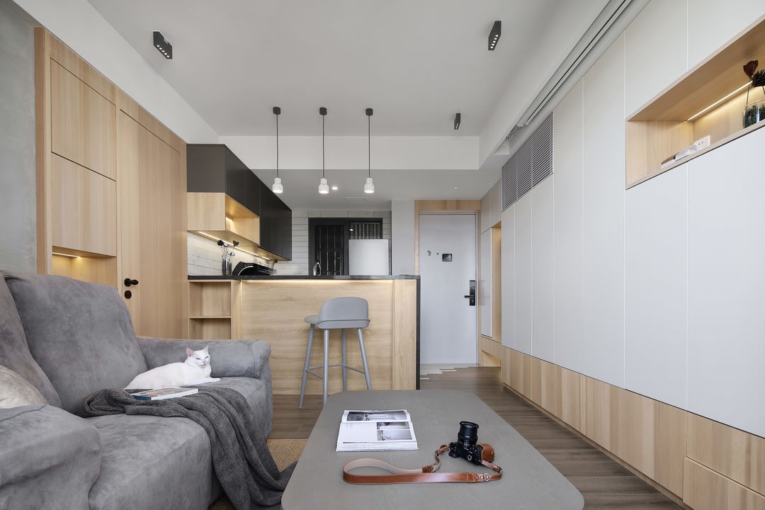 入戶門位置調整縮小,增加一整面的收納柜,滿足海量收納需求。