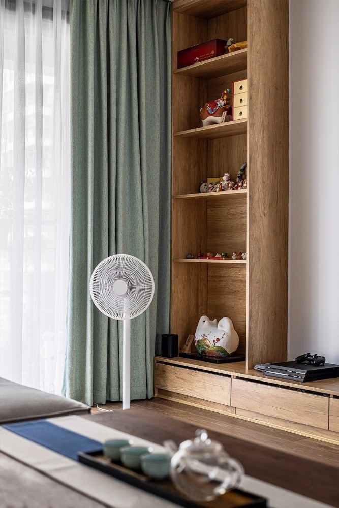 客廳利用半墻加窗戶的形式與書房連接,并在沙發背景墻左側利用書房空間做成了儲物柜,將行李箱安置地妥妥的,中部留空的設計便于小物件的取放。