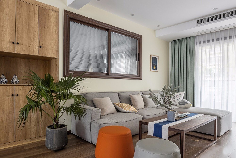 客廳,沙發背景墻和門廳墻面刷成了淡淡的黃色,深咖啡色的窗框,原木色的柜子,整體彌漫著樸質與自然的味道。