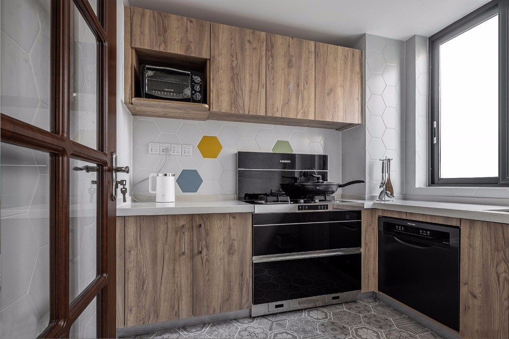 廚房墻面鋪設淺灰色六角磚,點綴藍色黃色與綠色,為空間增添了跳躍靈動感。與木質櫥柜完美結合,簡約自然中透露著精致感。