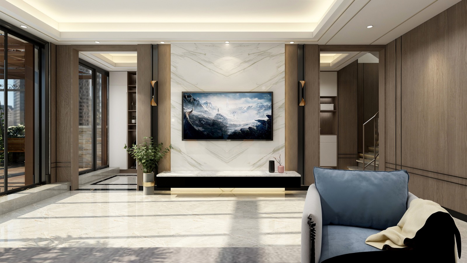 電視背景墻采用滿墻的大理石紋瓷磚,懸空的電視柜,高級感十足。