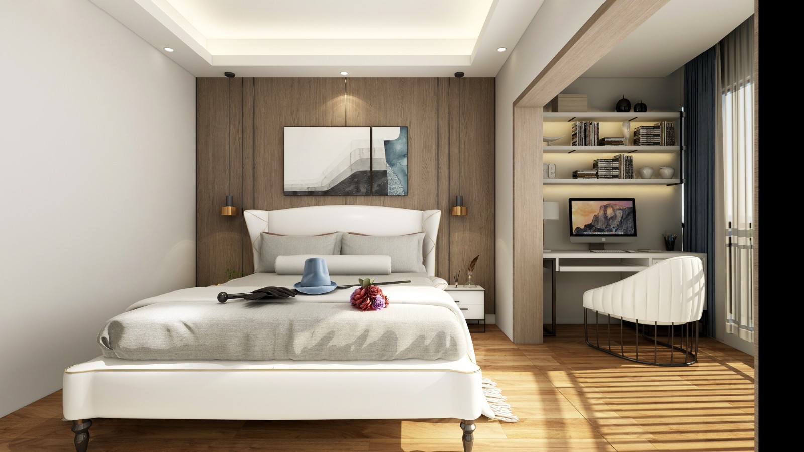 主臥將陽臺打通,在增大的室內空間里打造出一個專屬的工作區。