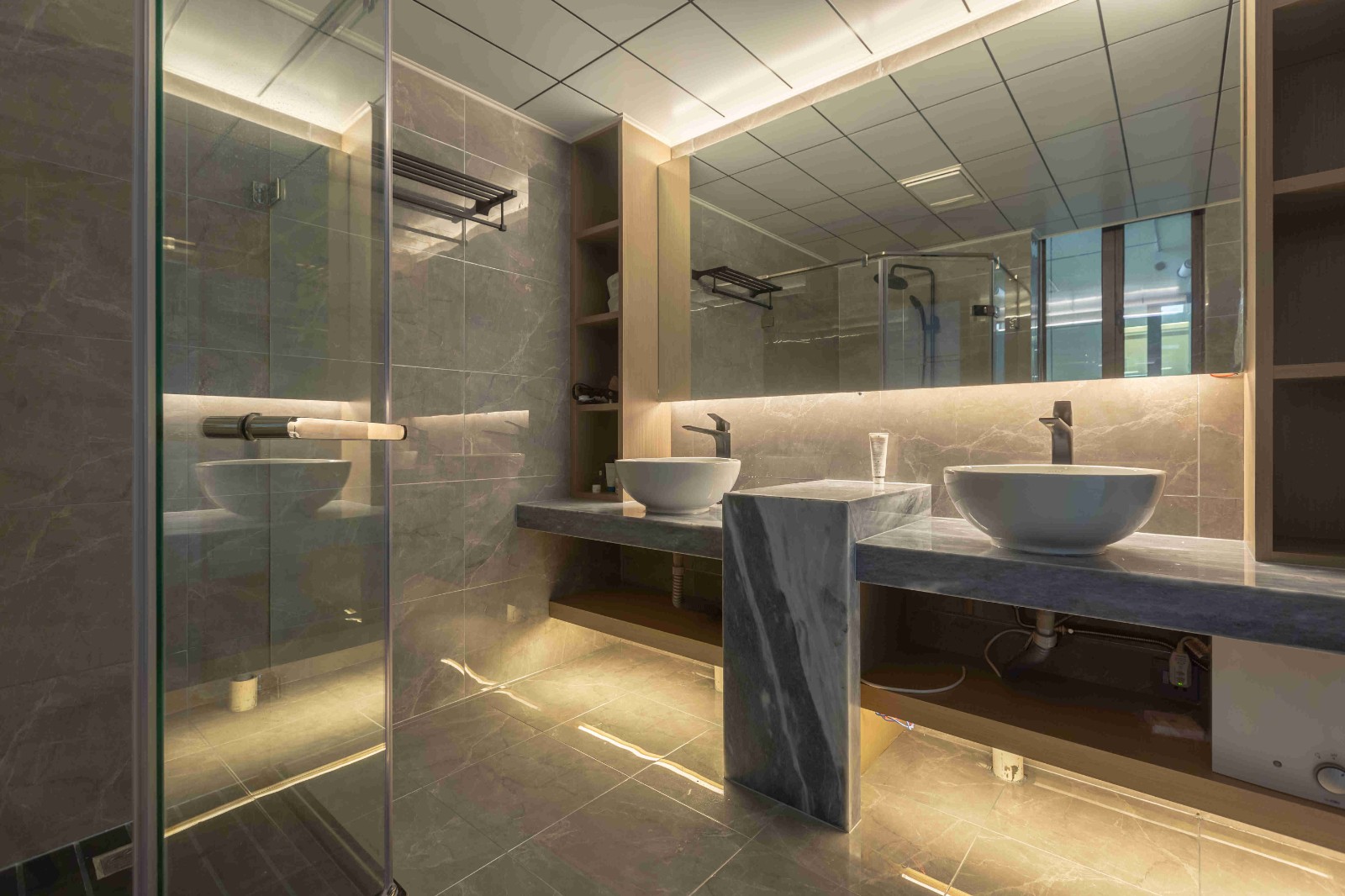 灰色大理石瓷磚和洗手臺,兩個洗手池,巨大的鏡子,后面藏著隱藏的燈管,簡潔大氣。