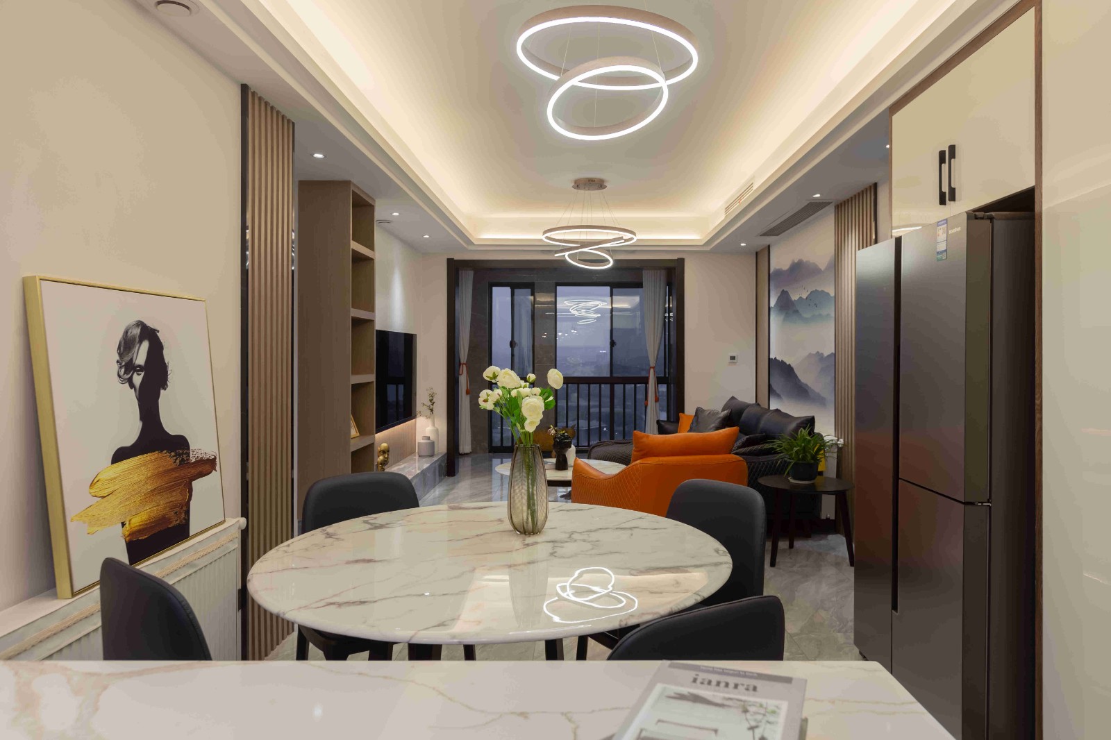 冰箱嵌入餐邊柜之中,大理石圓桌搭配四把皮質餐椅,靠墻倚立的藝術照,客廳同款的工藝吊燈,低調奢華。