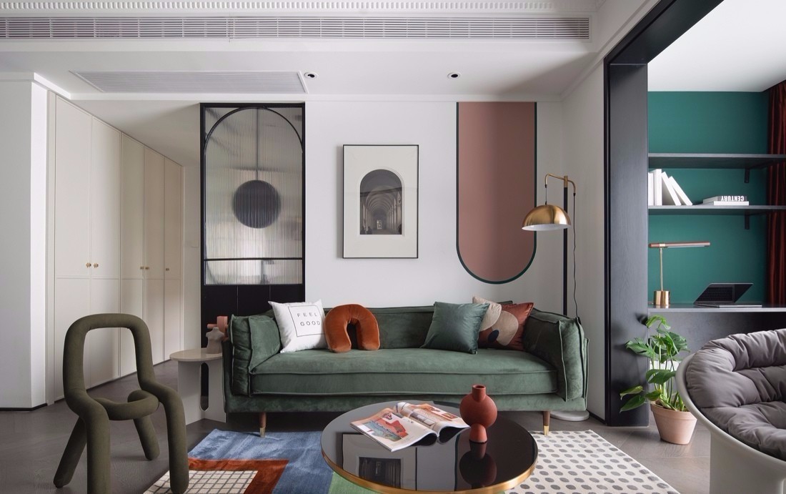 客廳空間以白色為主色調,融入墨綠、酒紅、臟粉等低飽和度彩色,為空間增添了繽紛、動感的視覺效果。